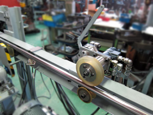 切断後の製品をレールの後端まで搬送し、シリンダーで押出します